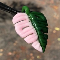 Beautiful dark green and pale pink Monstera Leaf Pendant made from durable borosilicate glass. Imperfectly bisected with one half green and one-half pink. A little bleed-through of green onto the pink side is cause for the discount. Handcrafted by the artist, signed and dated 2023. The stem creates a loop that can accommodate 3mm cords or chains. A black woven cord is included. 1.5in. wide and just under 2in. tall.