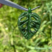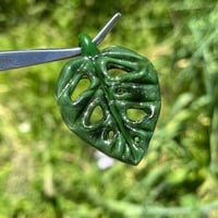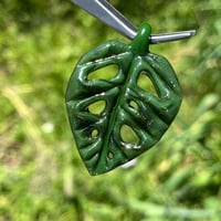 Beautiful dark green sparkly Swiss cheese Monstera Leaf Pendant made from durable borosilicate glass. Handcrafted by the artist, signed. The stem creates a loop that can accommodate 3mm cords or chains. A black woven cord is included. 1.25. wide and just under 2in. tall.